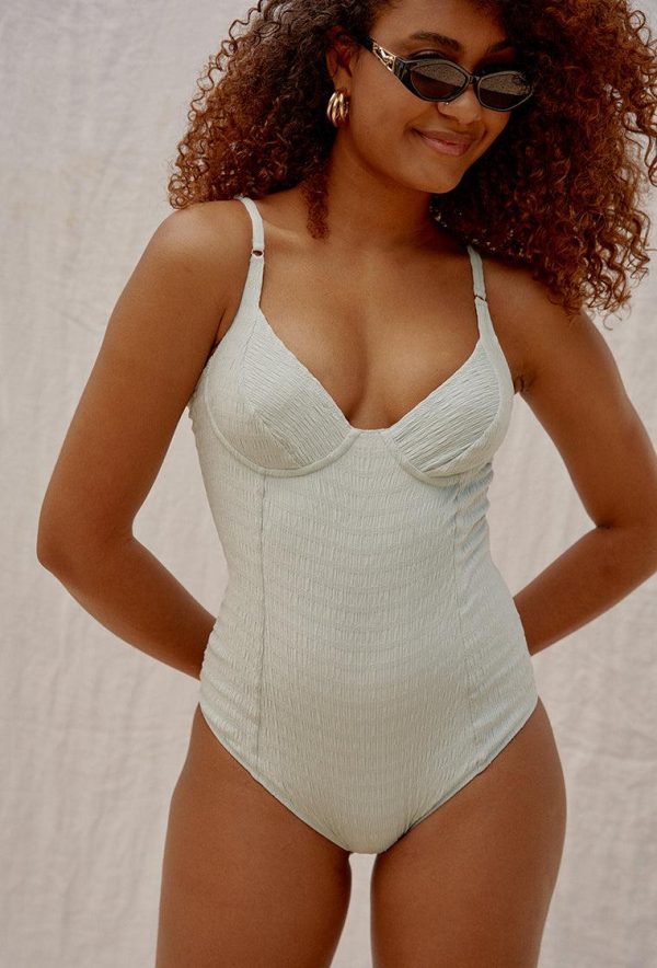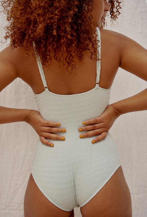 Bañador halter con falso aro en tejido con textura. Pernera de corte alto, tirantes regulables y braguita clásica. Detalle de costuras a lo largo del tejido.