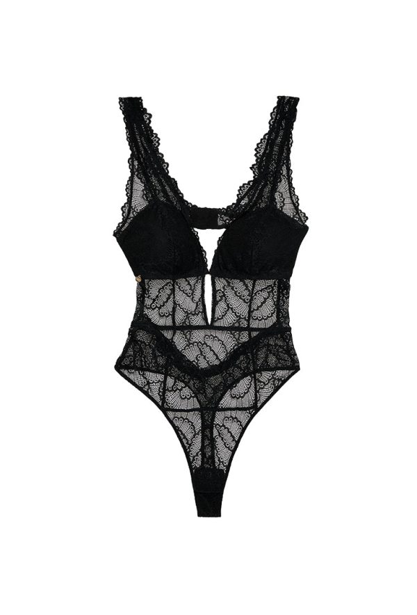 Body lencero en tejido de encaje geométrico. Copas con relleno ligero extraíble y con forro en la zona del pecho para evitar transparencias y una suave banda elástica en la cintura para ajustarse a tu cuerpo. Cierre en la parte inferior con botones a presión, dos posiciones.