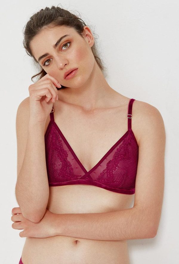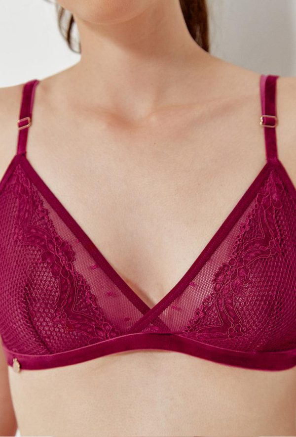 Bralette triangular con una exquisita mezcla de encaje y plumeti que aporta un toque de sensualidad y elegancia. Disfruta de la comodidad de sus tirantes ajustables de terciopelo y el práctico corchete trasero para un ajuste perfecto. Diseñado sin foam para ofrecerte una sensación de libertad y naturalidad absoluta.