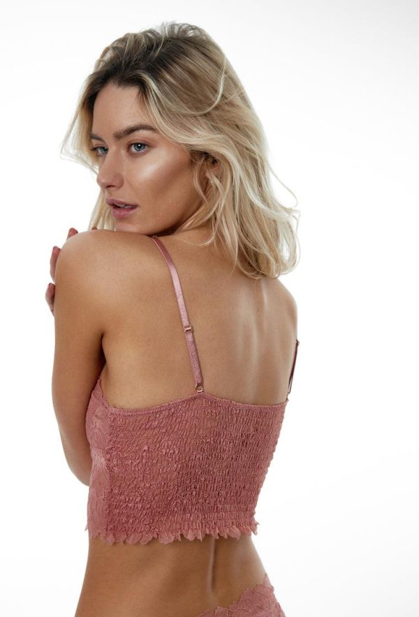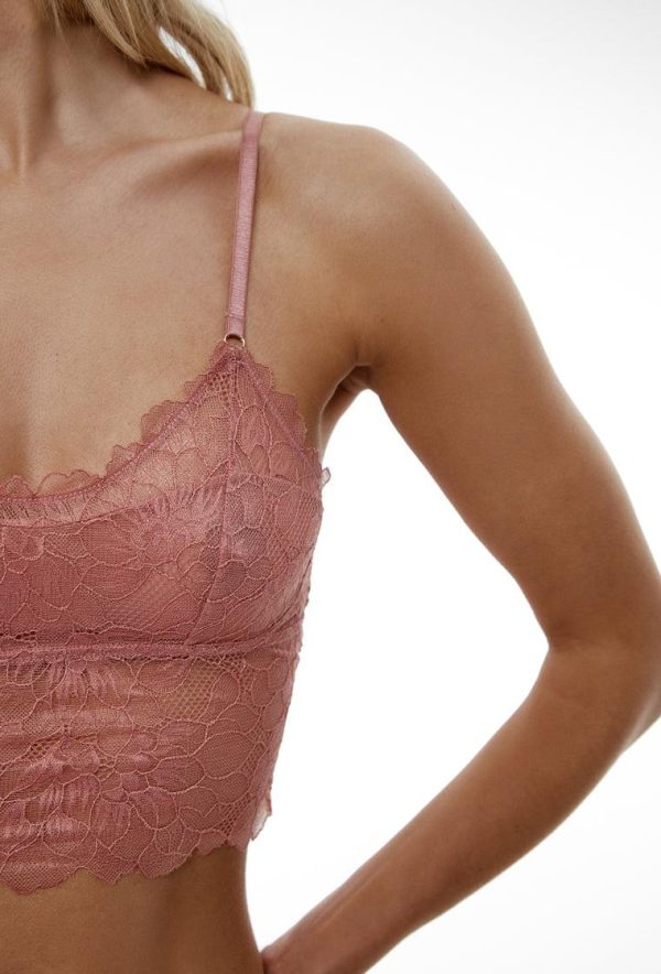 Un sujetador crop top de escote balconette con tejido de encaje semitransparente floral. Cuenta con costuras en el escote diseñadas para adaptarse a la forma del pecho. Tirantes finos regulables de satén y espalda de nido de abeja elástico. Detalle de forro en tul extra suave. Sin foam.