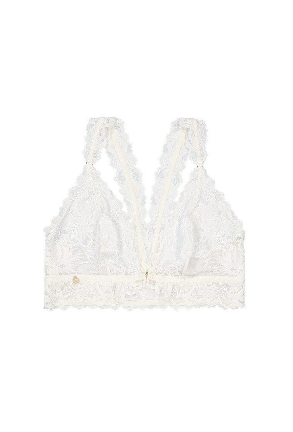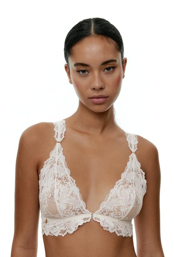 Nuestro bralette Piaf vuelve en color gardenia. La elegancia de su escote halter con encaje floral está diseñado para destacar. Tirantes no ajustables en forma de V en la espalda y un moderno cierre delantero metálico. Su escote semi-transparente sin incluir forro ni foam, realza tu figura sutilmente.