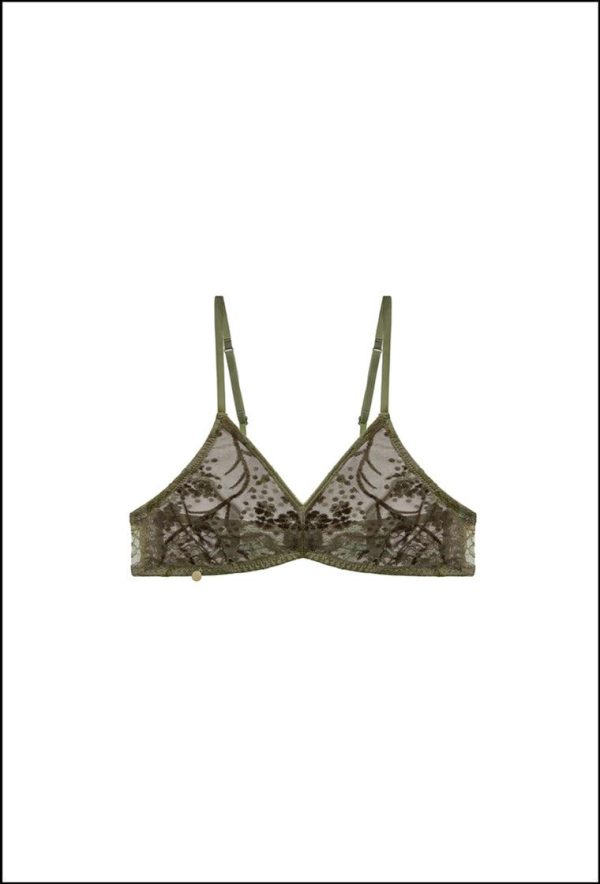 Bralette con detalles florales de terciopelo en la parte delante y encaje en la parte trasera. Tiene tirantes ajustables, corchete trasero y no tiene foam.