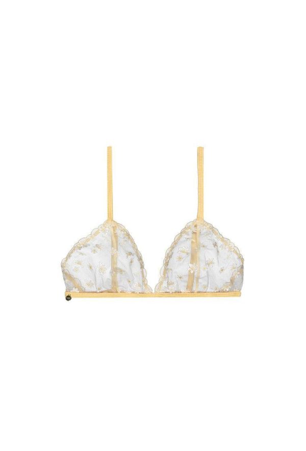 Bralette triangular Kira, diseñado en tul bordado floral transparente, en un llamativo color pale yellow. Este diseño no incluye foam, apostando por la naturalidad. Con tirantes regulables y diseño sin aro. Si buscas un bralette divertido y diferente, este es el tuyo.