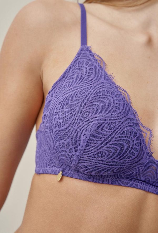 Sujetador sin aro de escote triangular en original tejido de encaje con diseño paisley y detalle en los acabados. Efecto falso aro y ballena flexible en los laterales para recoger y realzar el pecho. Forro semitransparente en la parte delantera. Tirantes regulables y cierre en la espalda.