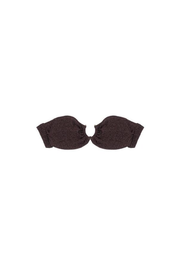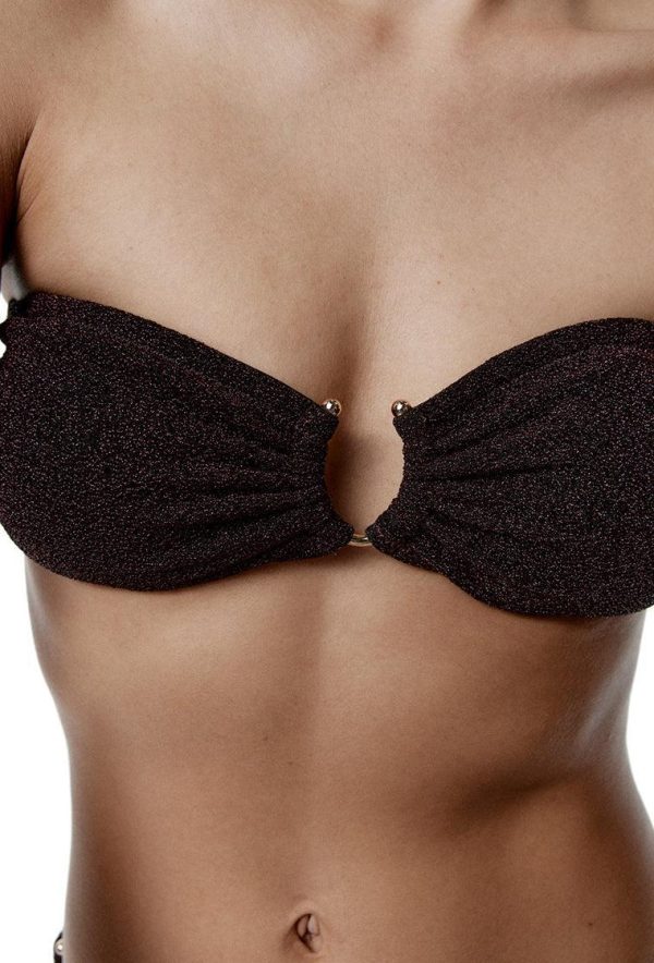 Top de bikini Nova, en color café expresso. Su tejido con destello en sinónimo de elegancia e innovación. Resalta por su diseño bandeau, aportando un look sofisticado y moderno. Incorpora foam extraíble para mayor comodidad. Cuenta con cierre trasero para un ajuste seguro. Sus tirantes extraíbles permiten un ajuste personalizado. Destaca por su detalle en el centro del pecho metálico. Un must para disfrutar del verano con estilo y comodidad.