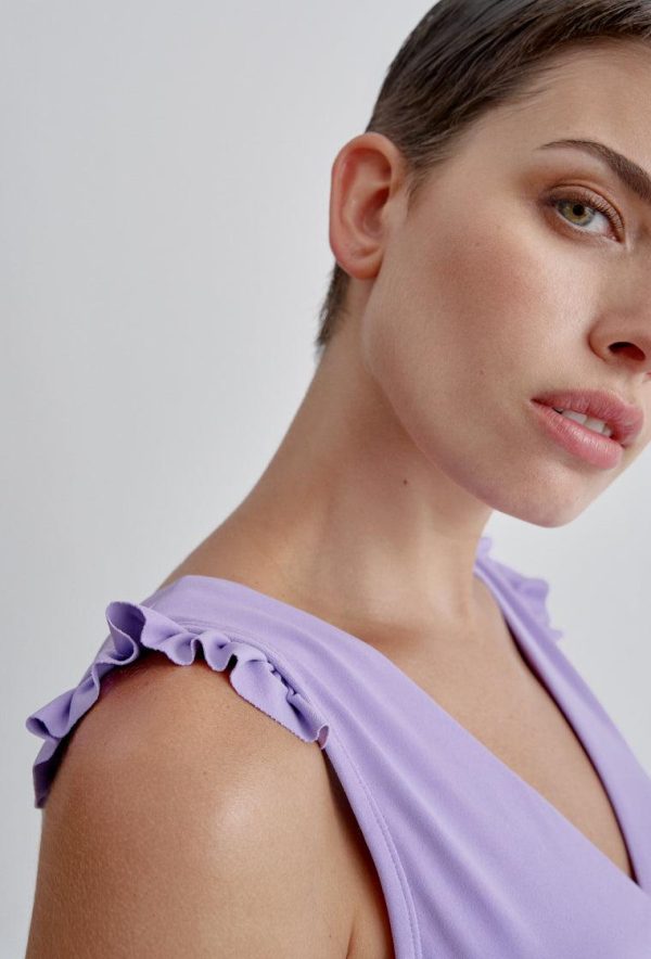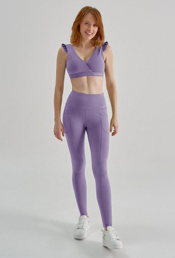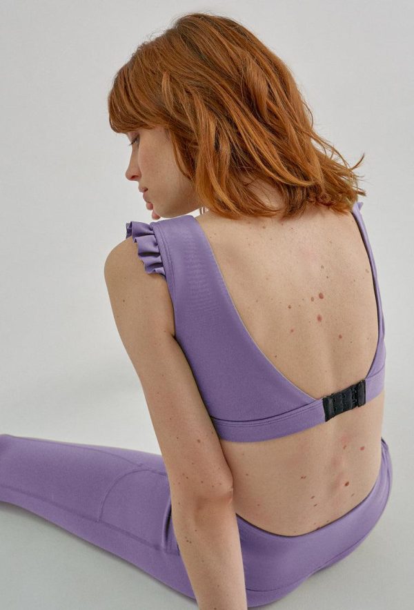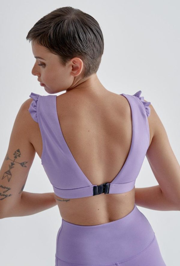 Sujetador deportivo de sujeción media, con tirantes fijos y cierre trasero. Detalle cruzado en la parte frontal y volantes en los tirantes. Foam ligero extraíble.